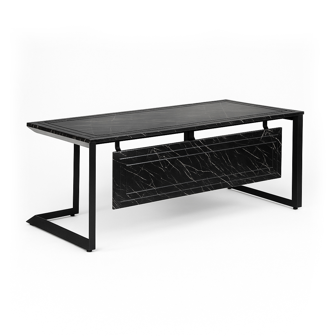 میز مدل سارینا ترکیبی از طراحی خاص، مدرنیته و کیفیت بالا است. صفحهی مشکی با طرح سنگ مرمر و پایههای فلزی زاویهدار، جلوهای متفاوت و لوکس به محیط اداری میدهد. طراحی این میز، همزمان سادگی و جسارت را در خود جای داده است.